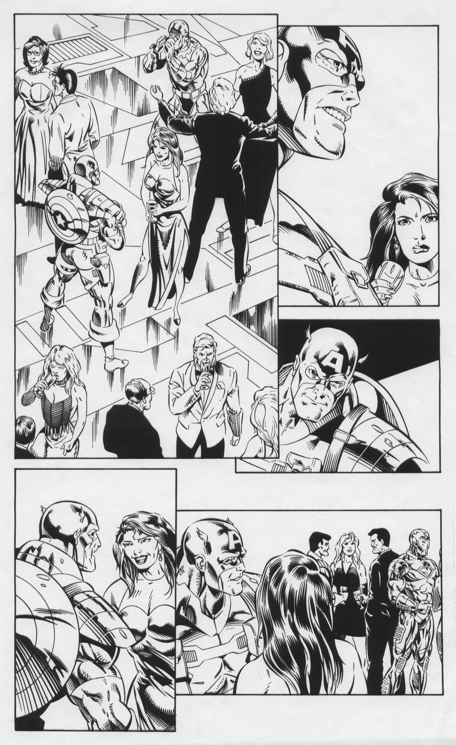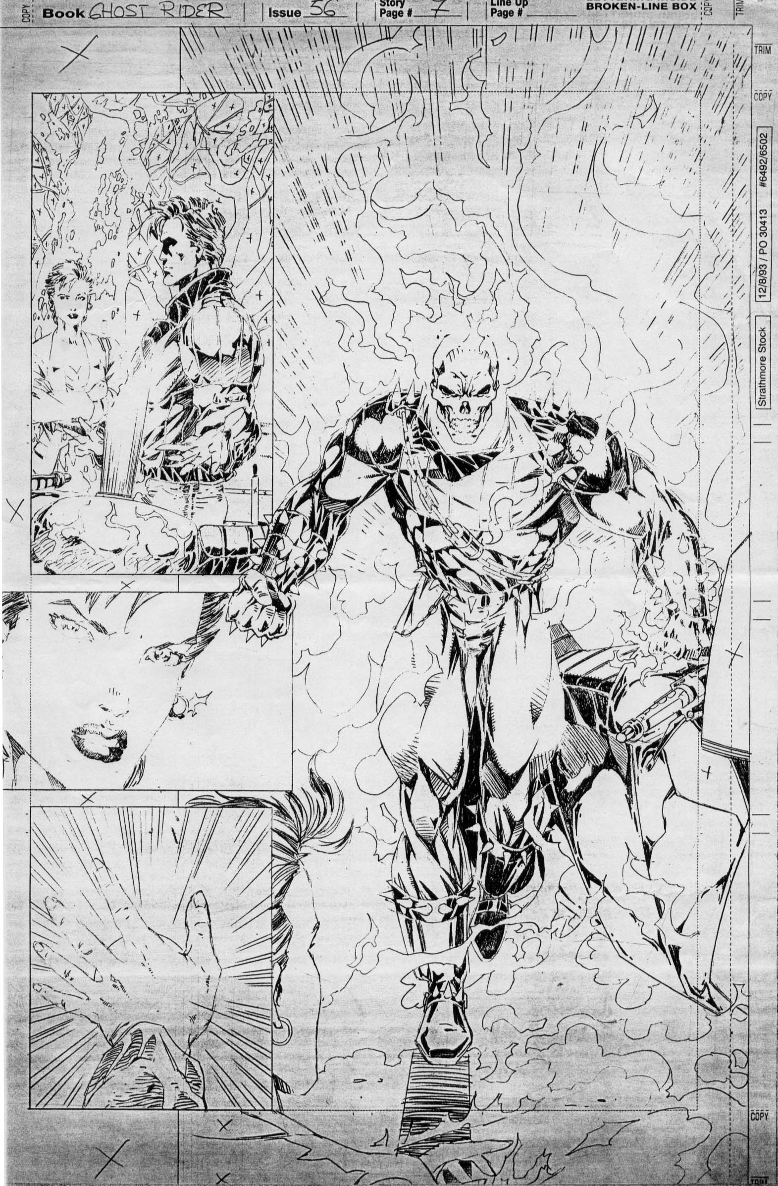 On page 2 I had an entry “AVENGERS BY TOM DERENICK, Vintage Sample Art” where I inked Tom on 3 pages of Avengers material from the late 1990s. But that was but a sliver of my sample ink work. From the mid-late ’90s into the early 2000s I did a lot of samples over tracing vellum (taped on top of the pencils photocopy) which I abhor. But it was the most-common way that inkers did these in the pre-blueline-on-your-computer days. I cannot cite exact issue for these thumbnails but I can name titles and pencil artists (L-R, top-bottom): Ron Lim on THE INFINITY CRUSADE, Dave Ross on FORCEWORKS, Salvador Larocca on GHOST RIDER, Steven Butler on WEB OF SPIDER-MAN, Tom Grindberg on SILVER SURFER and Tom Raney on the WARLOCK CHRONICLES (2 pages). More samples continue in the next entry. Ultimately, many of these samples on vellum w/ the copies attached were either given away to friends or sold for prices like $1 – $10 depending on the content. The reason for the low value is that even though it was original ink art, it wasn’t the published version and few want to frame a crinkly vellum page. Usually it was amateur inkers trying to hone their skills to break into the biz that got the most use out of these.