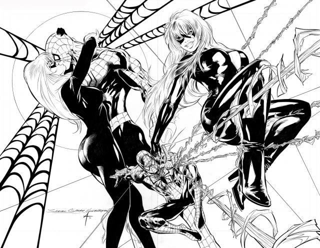 My third Michael Finn “One Minute Later” commission, he continues to put me through the ink wringer;-) This time, I had to ink a wraparound ‘cover’ for the original cover of Amazing Spider-man by Al Milgrom. This is my second Hawbaker job, and the first one can be found waaaay back on page one of my archived gallery with Batman and the Joker, which was also a giant-sized commission piece. It’s my eighth Spidey commission if you count pieces with him as only or mostly as Peter Parker. But this is seemingly my first Black Cat, which seems odd to me as I would have sworn that I’ve inked her before in a commission. (The Golden-age Black Cat by James Lyle from three years prior doesn’t count.) The client asked me to alter Felicia’s over-sized breast proportions in both poses to something more realistic, and to remove her leather-protruding nipples. This kind of ‘plastic surgery’ request is something I’m used to doing for those who’ve followed my gallery, usually for pieces for client Michael Rankins. I used all of my usual inking paraphernalia to ink this one, which took me a longer time than usual to finish, but not nearly as long as the previous job by Segovia;-) But work by SCH is a pleasure because it’s probably my closest experience to inking Neal Adams’ style of penciling. I was finished on January 20, 2011.